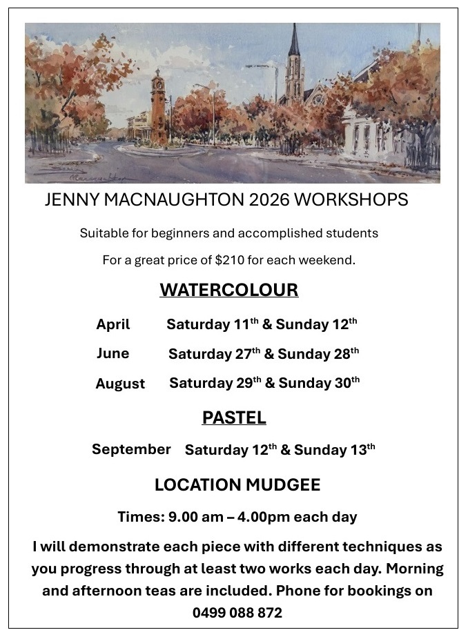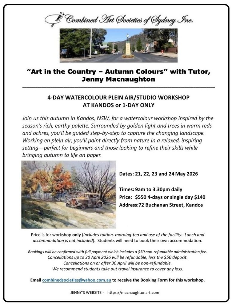 Jenny will be conducting another watercolour workshop in Kandos through the Combined Art Societies of Sydney, and once again this workshop can be booked for the full 4 day period, or you may select just one day.